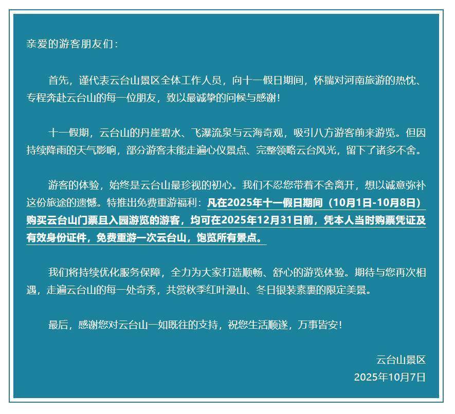 据云台山景区官方公众号消息:十一假期,云台山的丹崖碧水、飞瀑流泉与云海奇观,吸引八方游客前来游览。但因持续降雨的天气影响,部分游客未能走遍心仪景点、完整领略云台风光,留下了诸多不舍。游客的体验,始终是云台山最珍视的初心。我们不忍您带着不舍离开,想以诚意弥补这份旅途的遗憾。特推出免费重游福利:凡在2025年十一假日期间(10月1日-10月8日)购买云台山门票且入园游览的游客,均可在2025年12月31日前,凭本人当时购票凭证及有效身份证件,免费重游一次云台山,饱览所有景点。