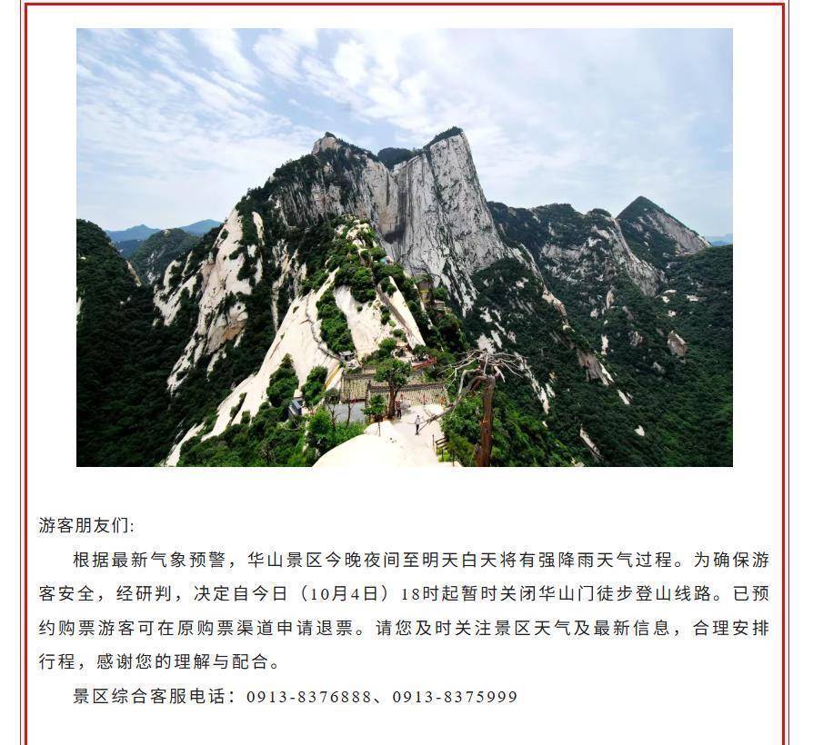 极目新闻记者发现,华山景区于10月4日发布公告称,根据最新气象预警,华山景区当晚夜间至次日白天将有强降雨天气过程。为确保游客安全,经研判,决定自4日18时起暂时关闭华山门徒步登山线路。已预约购票的游客可在原购票渠道申请退票。