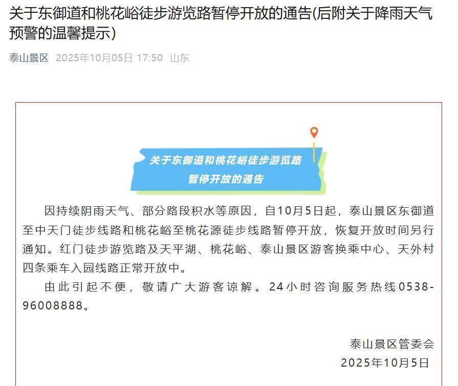 泰山景区也于10月5日发布公告称,因持续阴雨天气、部分路段积水等原因,自10月5日起,泰山景区东御道至中天门徒步线路和桃花峪至桃花源徒步线路暂停开放,恢复开放时间另行通知。红门徒步游览路及天平湖、桃花峪、泰山景区游客换乘中心、天外村四条乘车入园线路正常开放中。